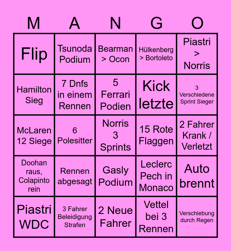 This bingo card has 25 words: Rennen abgesagt, 2 Neue Fahrer, 5 Ferrari Podien, Piastri WDC, Piastri > Norris, Flip, Hamilton Sieg, Tsunoda Podium, 15 Rote Flaggen, Gasly Podium, Kick letzte, McLaren 12 Siege, Leclerc Pech in Monaco, Auto brennt, 7 Dnfs in einem Rennen, Verschiebung durch Regen, 2 Fahrer Krank / Verletzt, Bearman > Ocon, 3 Verschiedene Sprint Sieger, 6 Polesitter, Norris 3 Sprints, 3 Fahrer Beleidigung Strafen, Doohan raus, Colapinto rein, Hülkenberg > Bortoleto and Vettel bei 3 Rennen.