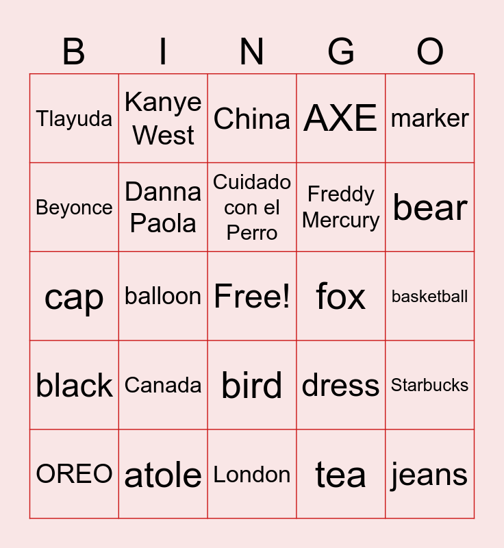 This bingo card has a free space and 29 words: OREO, BTS, balloon, Spiderman, Tlayuda, China, Danna Paola, Canada, fox, atole, basketball, jeans, London, tea, bear, beer, bird, black, marker, cap, dress, Luis Miguel, Freddy Mercury, Beyonce, AXE, Kanye West, Starbucks, Cuidado con el Perro and Converse.