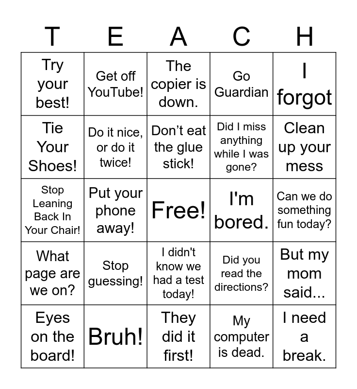This bingo card has a free space and 74 words: When is recess?, When is lunch?, The copier is down., Eyes on your own paper., Time for another test, That sounds like a personal problem., Keep your hands to yourself!, Personal space!, Eyes on the board!, Didn’t you just use the bathroom?, Level 0, If I can’t read it, I can’t grade it!, Don’t eat the glue stick!, Tie Your Shoes!, Nice to see you, long time no see!, Put your phone away!, No Airpods!, Clean up your mess, Put Your Name on Your Paper!, Stop Leaning Back In Your Chair!, Do it nice, or do it twice!, Get off YouTube!, Go Guardian, No You can't listen to music., I need a break., I'm so tired!, I'm done, now what do I do?, Class, Class, It's not mine, I don't know, I forgot, Raise your hand, I'm just going to wait until it's quiet, You're wasting your recess time!, If you don't do your work, you will miss Fun Friday., My computer is dead., How many days until summer?, What in the world?, The bathroom is not a playground., Worry about yourself., They did it first!, Bruh!, I don't have a pencil., Eyes on your own screen., Focus!, Try your best!, Make a better choice!, Stop guessing!, Are you kidding me?, What are we supposed to do?, Does spelling count?, Is this for a grade?, Can we do something fun today?, But you didn't tell me we had to turn it in!, Can I go to the bathroom?, Can I get a drink of water?, I didn't know we had a test today!, I don't get it., Do we have to write this down?, But my mom said..., Did I miss anything while I was gone?, I wasn't talking., What page are we on?, I wasn't on my phone., I'm bored., When is this due?, Do we have to write in complete sentences?, Teacher. Teacher. Teacher., Did you read the directions?, Sit in your chair., Show your work., “A sentence starts with a capital letter and ends with a period.”, Push your chair in. and It's on the board..