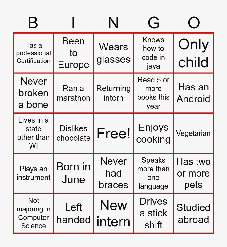 This bingo card has a free space and 24 words: Born in June, Left handed, Returning intern, Not majoring in Computer Science, Only child, Has a professional Certification, Never broken a bone, Been to Europe, Enjoys cooking, Never had braces, Read 5 or more books this year, Lives in a state other than WI, Speaks more than one language, Has two or more pets, Ran a marathon, Drives a stick shift, Vegetarian, Wears glasses, Has an Android, Dislikes chocolate, Studied abroad, Plays an instrument, Knows how to code in java and New intern.