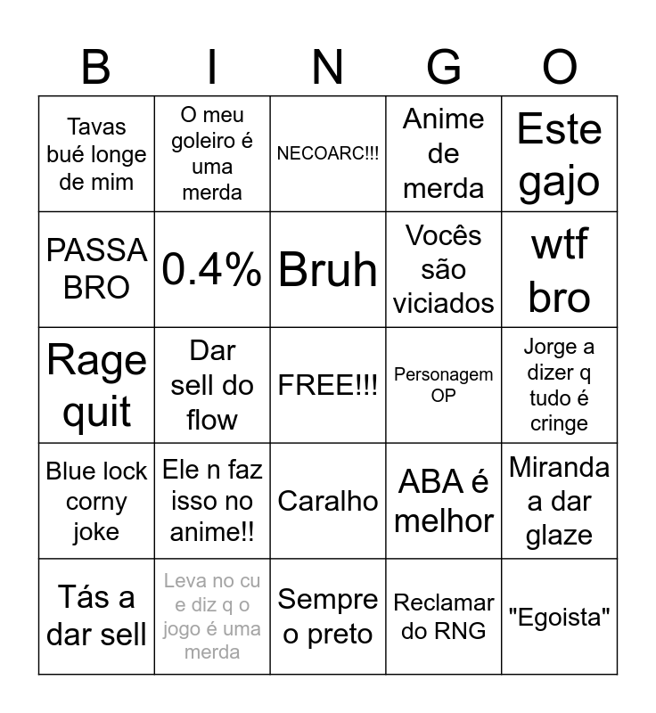 This bingo card has a free space and 24 words: Ele n faz isso no anime!!, Leva no cu e diz q o jogo é uma merda, Bruh, Tás a dar sell, Este gajo, Tavas bué longe de mim, PASSA BRO, O meu goleiro é uma merda, Personagem OP, Caralho, Vocês são viciados, Rage quit, ABA é melhor, Miranda a dar glaze, 0.4%, Reclamar do RNG, Jorge a dizer q tudo é cringe, NECOARC!!!, wtf bro, Dar sell do flow, "Egoista", Blue lock corny joke, Anime de merda and Sempre o preto.