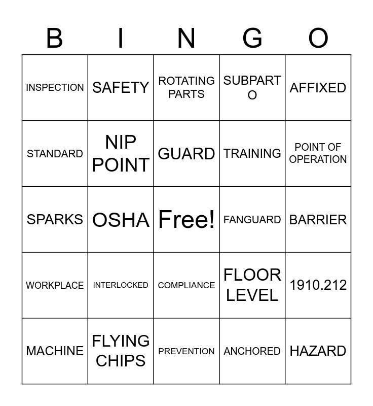 This bingo card has a free space and 24 words: INTERLOCKED, FLYING CHIPS, GUARD, MACHINE, AFFIXED, INSPECTION, STANDARD, SAFETY, FANGUARD, COMPLIANCE, TRAINING, SPARKS, FLOOR LEVEL, 1910.212, NIP POINT, ANCHORED, BARRIER, ROTATING PARTS, POINT OF OPERATION, OSHA, HAZARD, WORKPLACE, SUBPART O and PREVENTION.