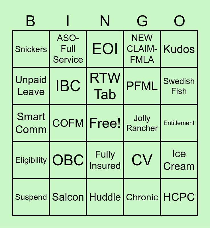 This bingo card has a free space and 92 words: Tasks, Claims, Huddle, VOC, Full File Review, Walk Up, Pend, Suspend, Approved, Terminated, Closed, Denied, State Disability, PFML, ADAAA, Kudos, EOI, Pre-ex, Part Time RTW, Accommodation, Workers' Compensation, Service Items, CM, CSR, OBC, IBC, CBR, Letter, Email, Phone, Salcon, Fully Insured, ASO-ATP, ASO-BD, ASO-Full Service, New Claim, Elig Tab, Medical Tab, RTW Tab, CV, Smart Comm, Eligibility, Entitlement, Certification, HCPC, Right's Package, 1250, 75 mile radius, 1 year service, 12 weeks, Schedule, Serious Health Condition, Treatment 2x/year, Continuous, Intermittent, FMLA, Job Protection, Unpaid Leave, OSHC, COFM, Bonding, Personal Leave, IA, F/D, Recertification, Chronic, Absence Settings, Rolling Backwards, With History, Without History, FFD, 3 day elig check, NEW CLAIM-FMLA, NEW CLAIM-STD, Strawberry Bon Bons, Nerd Clusters, Ice Cream, Sour Gummies, Starburst, Skittles, M&Ms, Jolly Rancher, Snickers, Twix, Kit Kat, Butterfinger, Reese's, Hershey's, Tootsie Roll, Almond Joy, Swedish Fish and Twizzlers.