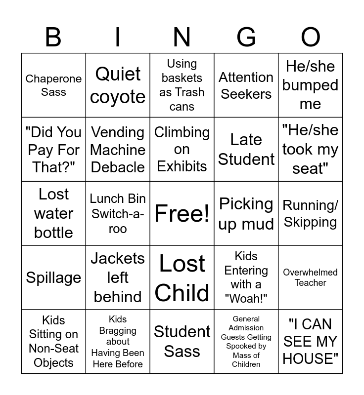 This bingo card has a free space and 59 words: "Stop Playing With That!", Kids Bragging about Having Been Here Before, Rampaging Through Venue, Jumping/ Stomping, Overwhelmed Teacher, Teacher Preoccupied with Cell Phone, Vending Machine Debacle, Sad Bus Driver, Picking up mud, "Where's the Courtyard?", "Did You Pay For That?", Lost Chaperone, Late Student, Dead Bird, Minor Injury, Quiet coyote, Climbing on Exhibits, Attention Seekers, Bored Complaints, Lost water bottle, Lunch Bin Switch-a-roo, Using baskets as Trash cans, "I'M HUNGRY", Running/ Skipping, M.I.A During Seating, Bus Troubles, Lost Child, Kid Hits Chaperone With Trash Can Lid, He/she bumped me, "WHY did you bring money?", Are we there yet?, Kid with cell phone, Snack Inquiries, Late Check-In, Chaperone Sass, Breakage, Lost bus, Kids Entering with a "Woah!", Voicemails Calls from School, Spillage, Shoplifting Students, Student Sass, General Admission Guests Getting Spooked by Mass of Children, Uranus Jokes, Bus bathroom accident, Chaperone Appearing, Oblivious Students, Muddy Shoes On Seats in bus, "He/she took my seat", Kids Sitting on Non-Seat Objects, Recording Planetarium Shows, "Sarcastic" Children, Entitled Parent, "I CAN SEE MY HOUSE", Tour guides with Whistles, Jackets left behind, Lost Item that shouldn't have been there anyway, Bathroom Requests and "When are we going back?".