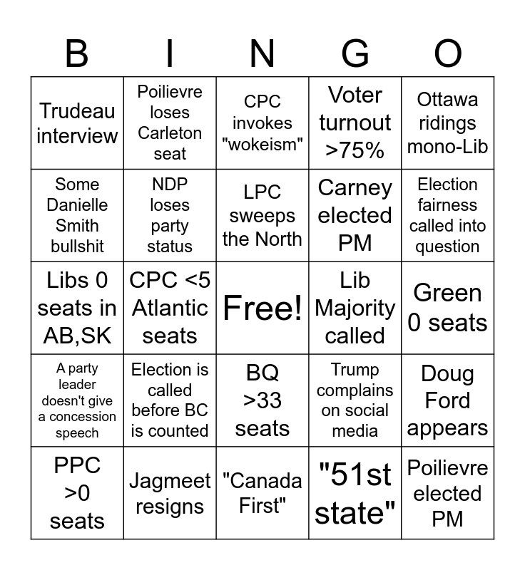 This bingo card has a free space and 24 words: Election is called before BC is counted, Jagmeet resigns, LPC sweeps the North, PPC >0 seats, Ottawa ridings mono-Lib, Trudeau interview, Some Danielle Smith bullshit, Poilievre loses Carleton seat, Lib Majority called, BQ >33 seats, Carney elected PM, Libs 0 seats in AB,SK, Trump complains on social media, Doug Ford appears, NDP loses party status, "51st state", Green 0 seats, CPC invokes "wokeism", Election fairness called into question, CPC <5 Atlantic seats, Poilievre elected PM, A party leader doesn't give a concession speech, Voter turnout >75% and "Canada First".