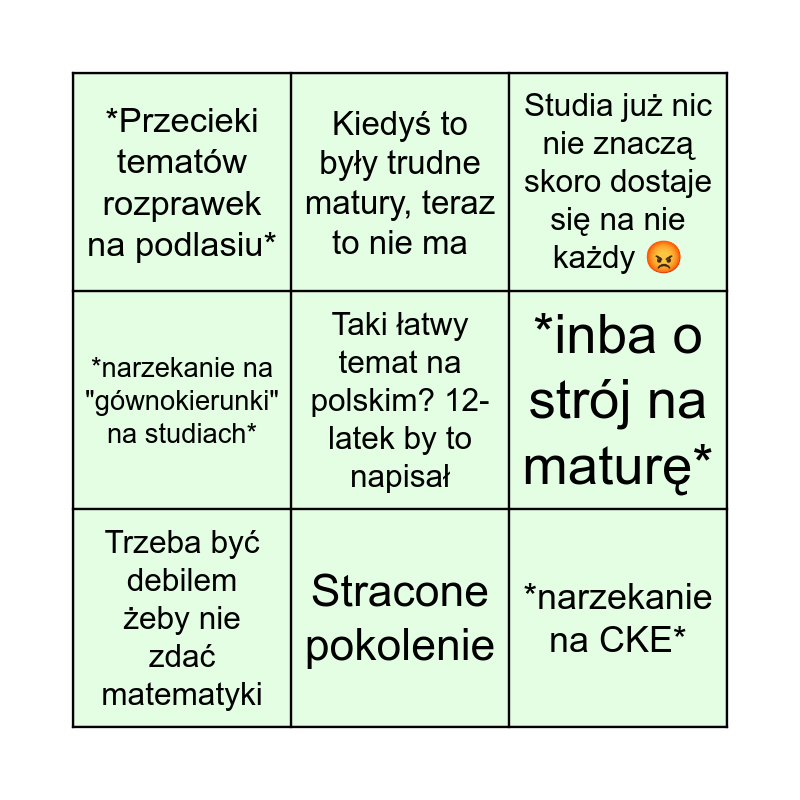 This bingo card has 9 words: Trzeba być debilem żeby nie zdać matematyki, Taki łatwy temat na polskim? 12-latek by to napisał, Studia już nic nie znaczą skoro dostaje się na nie każdy 😡, *Przecieki tematów rozprawek na podlasiu*, Kiedyś to były trudne matury, teraz to nie ma, *inba o strój na maturę*, *narzekanie na "gównokierunki" na studiach*, Stracone pokolenie and *narzekanie na CKE*.