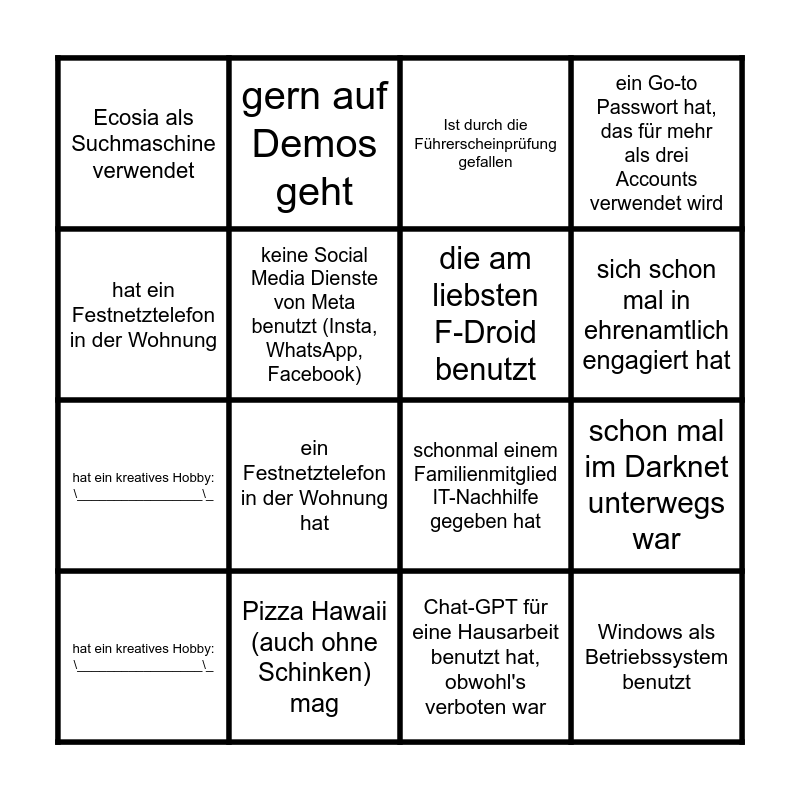 This bingo card has 94 words: regelmäßig SMS schreibt, Mastodon benutzt, Linux als Betriebssystem benutzt, gern auf Demos geht, schon mal eine E-Mail verschlüsselt hat, gern Mate trinkt, keine Social Media Dienste von Meta benutzt (Insta, WhatsApp, Facebook), sich schon mal in ehrenamtlich engagiert hat, DuckDuckGo als Suchmaschine verwendet, schonmal einem Familienmitglied IT-Nachhilfe gegeben hat, Windows als Betriebssystem benutzt, Chat-GPT für eine Hausarbeit benutzt hat, obwohl's verboten war, ein go-to Passwort hat, dass für mehr als drei Accounts verwendet wird, hat ein kreatives Hobby: \_________________\_, hat ein Haustier: \________________\_, hat ein Festnetztelefon in der Wohnung, Ist durch die Führerscheinprüfung gefallen, Pixelfed benutzt, regelmäßig SMS schreibt, Mac als Betriebssystem nutzt, Bitte und Danke zu ChatGPT sagt, Mag Pizza Hawaii (auch ohne Schinken), Ecosia als Suchmaschine verwendet, Startpage als Suchmaschine verwendet, ein Handy hat, das weder auf Android noch iOS läuft, die am liebsten F-Droid benutzt, Hat Timer auf Social Media Apps eingestellt, aktiv auf TikTok ist, bestätigt AGBs ohne diese zu lesen, schon mal im Darknet unterwegs war, schon mal Digital Detox gemacht hat, besitzt ein Shirt mit einem nerdigen Witz, Mastodon benutzt, Linux als Betriebssystem benutzt, gern auf Demos geht, schon mal eine E-Mail verschlüsselt hat, gern Mate trinkt, keine Social Media Dienste von Meta benutzt (Insta, WhatsApp, Facebook), sich schon mal in ehrenamtlich engagiert hat, DuckDuckGo als Suchmaschine verwendet, schonmal einem Familienmitglied IT-Nachhilfe gegeben hat, Windows als Betriebssystem benutzt, Chat-GPT für eine Hausarbeit benutzt hat, obwohl's verboten war, ein go-to Passwort hat, dass für mehr als drei Accounts verwendet wird, hat ein kreatives Hobby: \_________________\_, hat ein Haustier: \________________\_, hat ein Festnetztelefon in der Wohnung, Ist durch die Führerscheinprüfung gefallen, Pixelfed benutzt, regelmäßig SMS schreibt, Mac als Betriebssystem nutzt, Bitte und Danke zu ChatGPT sagt, Mag Pizza Hawaii (auch ohne Schinken), Ecosia als Suchmaschine verwendet, Startpage als Suchmaschine verwendet, ein Handy hat, das weder auf Android noch iOS läuft, die am liebsten F-Droid benutzt, Hat Timer auf Social Media Apps eingestellt, aktiv auf TikTok ist, bestätigt AGBs, ohne diese zu lesen, schon mal im Darknet unterwegs war, schon mal Digital Detox gemacht hat, besitzt ein Shirt mit einem nerdigen Witz, Mastodon benutzt, Linux als Betriebssystem benutzt, gern auf Demos geht, schon mal eine E-Mail verschlüsselt hat, gern Mate trinkt, keine Social Media Dienste von Meta benutzt (Insta, WhatsApp, Facebook), sich schon mal in ehrenamtlich engagiert hat, DuckDuckGo als Suchmaschine verwendet, schon mal einem Familienmitglied IT-Nachhilfe gegeben hat, Windows als Betriebssystem benutzt, ChatGPT für eine Hausarbeit benutzt hat, obwohl's verboten war, ein Go-to Passwort hat, das für mehr als drei Accounts verwendet wird, ein kreatives Hobby hat: \_________________\_, ein Haustier hat: \________________\_, ein Festnetztelefon in der Wohnung hat, durch die Führerscheinprüfung gefallen ist, Pixelfed benutzt, regelmäßig SMS schreibt, Mac als Betriebssystem nutzt, "Bitte" und "Danke" zu ChatGPT sagt, Pizza Hawaii (auch ohne Schinken) mag, Ecosia als Suchmaschine verwendet, Startpage als Suchmaschine verwendet, ein Handy hat, das weder auf Android noch iOS läuft, am liebsten F-Droid benutzt, Timer auf Social Media Apps eingestellt hat, aktiv auf TikTok ist, AGBs bestätigt, ohne diese zu lesen, schon mal im Darknet unterwegs war, schon mal Digital Detox gemacht hat and ein Shirt mit einem nerdigen Witz besitzt.