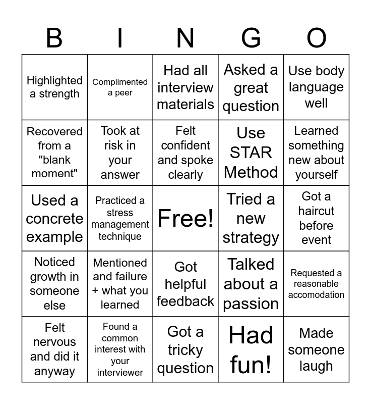 This bingo card has a free space and 24 words: Mentioned and failure + what you learned, Found a common interest with your interviewer, Felt confident and spoke clearly, Felt nervous and did it anyway, Use body language well, Highlighted a strength, Recovered from a "blank moment", Complimented a peer, Tried a new strategy, Got helpful feedback, Use STAR Method, Used a concrete example, Talked about a passion, Requested a reasonable accomodation, Took at risk in your answer, Had fun!, Got a haircut before event, Had all interview materials, Learned something new about yourself, Practiced a stress management technique, Made someone laugh, Noticed growth in someone else, Asked a great question and Got a tricky question.