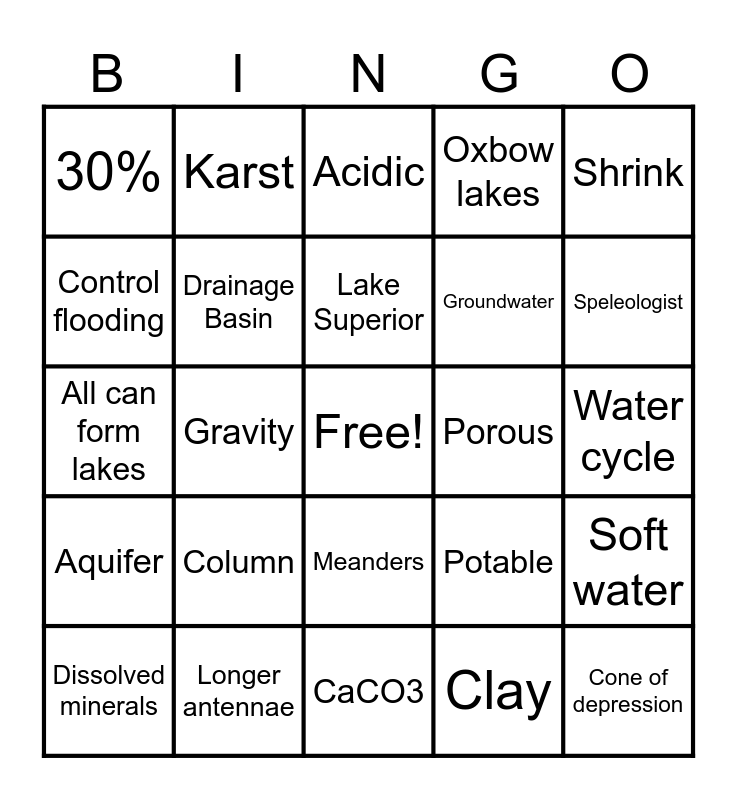 This bingo card has a free space and 35 words: Elevation Profile, Source, High gradient stream, Drainage Basin, Meanders, Oxbow lakes, Control flooding, Intermittent, Lake Superior, Lakes and ponds, All can form lakes, Shrink, Limnology, Seiche, 30%, Porous, Clay, Gravity, Aquifer, Cone of depression, Potable, Dissolved minerals, Soft water, Longer antennae, Acidic, Speleologist, Stalactite, Natural bridge, Groundwater, Water cycle, Hard water, CaCO3, Column, Karst and Sinkhole.