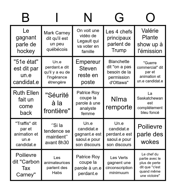 This bingo card has a free space and 24 words: ‘’Si la tendence se maintient’’ avant 8h30, Les animateurices parlent des Habs, Empereur Steven reste en poste, Poilievre dit ''Carbon Tax Carney'', Valérie Plante show up à l'émission, Le gagnant parle de hockey, ''51e état'' est dit par un.e candidat.e, Mark Carney dit qu'il est un peu québécois, Nîma remporte, Un.e candidat.e gagnant.e est saoul.e pour son discours, Blanchette dit ''on a pas besoin de la permission d'Ottawa'', Ruth Ellen fait un come back, Un.e candidat.e perdant.e est saoul.e pour son discours, Poilievre parle des wokes, Un.e perdant.e dit qu'il y a eu de l'ingérance étrengère, Les Verts gagnent une circonscription minimuum, La Saskatchewan est complètement bleu foncé, On voit une vidéo de Legault qui va voter en famille, ''Guerre commercial'' dit par et animation et un.e candidat.e, ''Séurité à la frontière'', Le chef du partie avec le plus de perte dit que ''c'est quand même une victoire'', ''Traffis'' dit par et animation et un.e candidat.e, Les 4 chefs principaux parlent de Trump and Patrice Roy coupe la parole à un.e perdant.e.