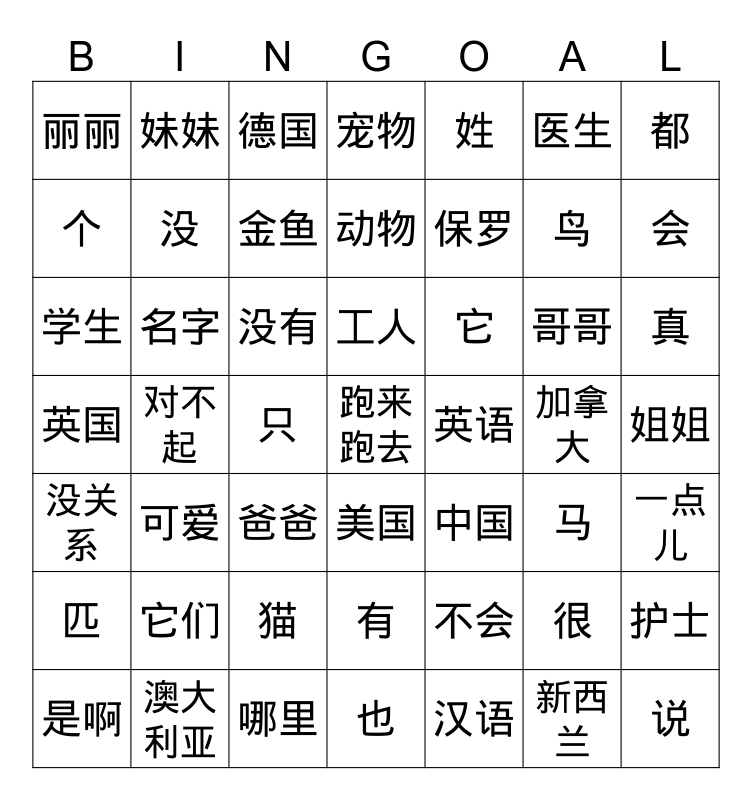 This bingo card has 67 words: 家, 爸爸, 妈妈, 哥哥, 姐姐, 弟弟, 妹妹, 有, 个, 也, 工人, 护士, 学生, 姓, 叫, 医生, 保罗, 丽丽, 呢, 没, 没有, 名字, 宠物, 只, 狗, 匹, 马, 条, 金鱼, 猫, 鸟, 很, 大, 小, 可爱, 真, 是啊, 它, 动物, 跑来跑去, 它们, 都, 会, 说, 汉语, 中国, 澳大利亚, 英国, 美国, 加拿大, 德国, 日本, 新西兰, 哪, 国, 对不起, 没关系, 请问, 小妹妹, 不会, 英语, 咦, 一点儿, 得, 哪里, 日语 and 德语.