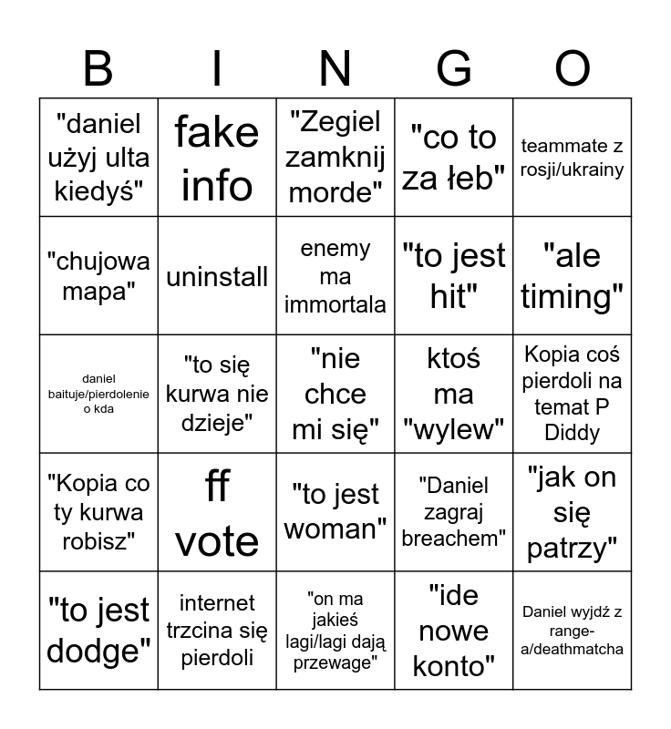 This bingo card has a free space and 24 words: ff vote, internet trzcina się pierdoli, enemy ma immortala, "to jest dodge", teammate z rosji/ukrainy, "daniel użyj ulta kiedyś", "chujowa mapa", fake info, ktoś ma "wylew", "to jest woman", "to jest hit", daniel baituje/pierdolenie o kda, "Daniel zagraj breachem", "jak on się patrzy", uninstall, "ide nowe konto", Kopia coś pierdoli na temat P Diddy, "Zegiel zamknij morde", "ale timing", "to się kurwa nie dzieje", Daniel wyjdź z range-a/deathmatcha, "Kopia co ty kurwa robisz", "co to za łeb" and "on ma jakieś lagi/lagi dają przewage".