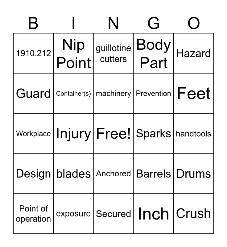 This bingo card has a free space and 24 words: blades, exposure, machinery, Point of operation, Hazard, 1910.212, Guard, Nip Point, Sparks, Anchored, Prevention, Workplace, Barrels, Drums, Container(s), Inch, handtools, guillotine cutters, Feet, Injury, Crush, Design, Body Part and Secured.