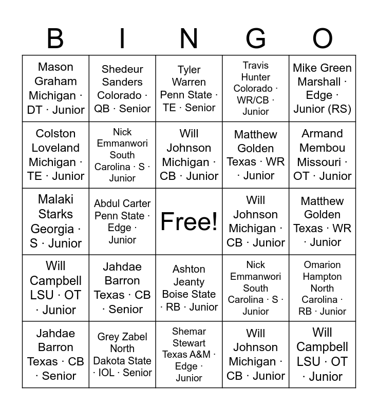 This bingo card has a free space and 89 words: Travis Hunter Colorado · WR/CB · Junior, Abdul Carter Penn State · Edge · Junior, Ashton Jeanty Boise State · RB · Junior, Mason Graham Michigan · DT · Junior, Jalon Walker Georgia · Edge · Junior, Tyler Warren Penn State · TE · Senior, Colston Loveland Michigan · TE · Junior, Cam Ward Miami · QB · Senior, Armand Membou Missouri · OT · Junior, Jahdae Barron Texas · CB · Senior, Will Campbell LSU · OT · Junior, Jihaad Campbell Alabama · LB · Junior, Omarion Hampton North Carolina · RB · Junior, Matthew Golden Texas · WR · Junior, Nick Emmanwori South Carolina · S · Junior, Will Johnson Michigan · CB · Junior, Tyler Booker Alabama · IOL · Junior, Emeka Egbuka Ohio State · WR · Senior, Tetairoa McMillan Arizona · WR · Junior, Shedeur Sanders Colorado · QB · Senior, Mike Green Marshall · Edge · Junior (RS), Mykel Williams Georgia · Edge · Junior, Shemar Stewart Texas A&M · Edge · Junior, Derrick Harmon Oregon · DT · Junior (RS), Malaki Starks Georgia · S · Junior, Grey Zabel North Dakota State · IOL · Senior, Kelvin Banks Jr. Texas · OT · Junior, Walter Nolen Mississippi · DT · Junior, Mason Taylor LSU · TE · Junior, Jaxson Dart Mississippi · QB · Senior, Travis Hunter Colorado · WR/CB · Junior, Abdul Carter Penn State · Edge · Junior, Ashton Jeanty Boise State · RB · Junior, Mason Graham Michigan · DT · Junior, Jalon Walker Georgia · Edge · Junior, Tyler Warren Penn State · TE · Senior, Colston Loveland Michigan · TE · Junior, Cam Ward Miami · QB · Senior, Armand Membou Missouri · OT · Junior, Jahdae Barron Texas · CB · Senior, Will Campbell LSU · OT · Junior, Jihaad Campbell Alabama · LB · Junior, Omarion Hampton North Carolina · RB · Junior, Matthew Golden Texas · WR · Junior, Nick Emmanwori South Carolina · S · Junior, Will Johnson Michigan · CB · Junior, Tyler Booker Alabama · IOL · Junior, Emeka Egbuka Ohio State · WR · Senior, Tetairoa McMillan Arizona · WR · Junior, Shedeur Sanders Colorado · QB · Senior, Mike Green Marshall · Edge · Junior (RS), Mykel Williams Georgia · Edge · Junior, Shemar Stewart Texas A&M · Edge · Junior, Derrick Harmon Oregon · DT · Junior (RS), Malaki Starks Georgia · S · Junior, Grey Zabel North Dakota State · IOL · Senior, Kelvin Banks Jr. Texas · OT · Junior, Walter Nolen Mississippi · DT · Junior, Mason Taylor LSU · TE · Junior, Jaxson Dart Mississippi · QB · Senior, Travis Hunter Colorado · WR/CB · Junior, Abdul Carter Penn State · Edge · Junior, Ashton Jeanty Boise State · RB · Junior, Mason Graham Michigan · DT · Junior, Jalon Walker Georgia · Edge · Junior, Tyler Warren Penn State · TE · Senior, Colston Loveland Michigan · TE · Junior, Cam Ward Miami · QB · Senior, Armand Membou Missouri · OT · Junior, Jahdae Barron Texas · CB · Senior, Will Campbell LSU · OT · Junior, Jihaad Campbell Alabama · LB · Junior, Omarion Hampton North Carolina · RB · Junior, Matthew Golden Texas · WR · Junior, Nick Emmanwori South Carolina · S · Junior, Will Johnson Michigan · CB · Junior, Tyler Booker Alabama · IOL · Junior, Emeka Egbuka Ohio State · WR · Senior, Tetairoa McMillan Arizona · WR · Junior, Shedeur Sanders Colorado · QB · Senior, Mike Green Marshall · Edge · Junior (RS), Mykel Williams Georgia · Edge · Junior, Shemar Stewart Texas A&M · Edge · Junior, Derrick Harmon Oregon · DT · Junior (RS), Malaki Starks Georgia · S · Junior, Grey Zabel North Dakota State · IOL · Senior, Kelvin Banks Jr. Texas · OT · Junior, Walter Nolen Mississippi · DT · Junior and Jaxson Dart Mississippi · QB · Senior.