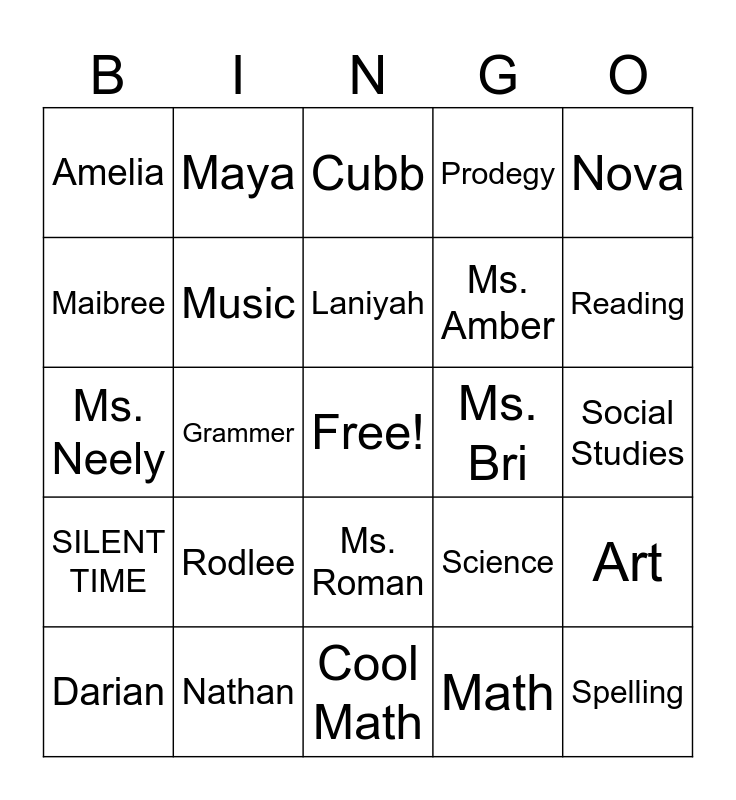 This bingo card has a free space and 24 words: Rodlee, Nathan, Laniyah, Darian, Nova, Amelia, Maibree, Maya, Ms. Bri, Ms. Roman, Ms. Amber, Ms. Neely, Science, Art, Music, Math, Social Studies, Cubb, Reading, Grammer, Spelling, SILENT TIME, Prodegy and Cool Math.