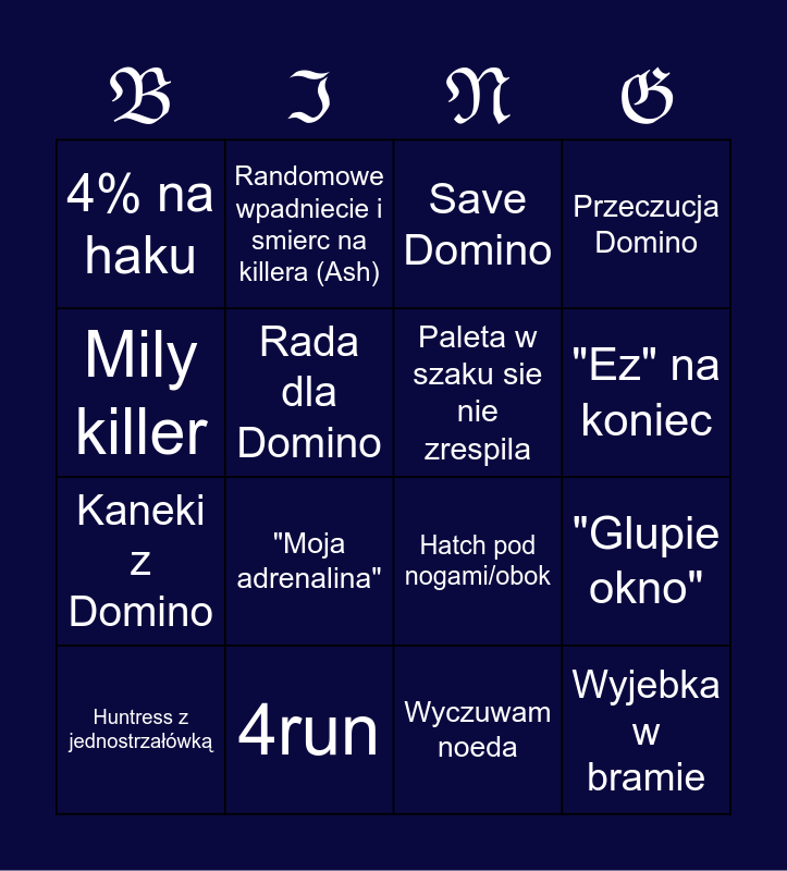 This bingo card has 16 words: 4run, "Glupie okno", Save Domino, 4% na haku, Kaneki z Domino, Randomowe wpadniecie i smierc na killera (Ash), Hatch pod nogami/obok, Wyczuwam noeda, Mily killer, Rada dla Domino, Huntress z jednostrzaΕΓ³wkΔ , Przeczucja Domino, "Moja adrenalina", "Ez" na koniec, Paleta w szaku sie nie zrespila and Wyjebka w bramie.