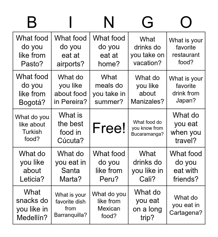 This bingo card has a free space and 25 words: What do you eat in Santa Marta?, What do you like from Mexican food?, What meals do you take in summer?, What snacks do you like in Medellín?, What is your favorite restaurant food?, What food do you like from Pasto?, What food do you like from Bogotá?, What food do you eat at airports?, What food do you know from Bucaramanga?, What food do you like from Peru?, What do you like about Manizales?, What do you like about Turkish food?, What drinks do you like in Cali?, What food do you eat with friends?, What do you like about food in Pereira?, What is your favorite Italian food?, What do you eat when you travel?, What food do you eat at home?, What is your favorite drink from Japan?, What is the best food in Cúcuta?, What do you eat in Cartagena?, What is your favorite dish from Barranquilla?, What do you like about Leticia?, What drinks do you take on vacation? and What do you eat on a long trip?.