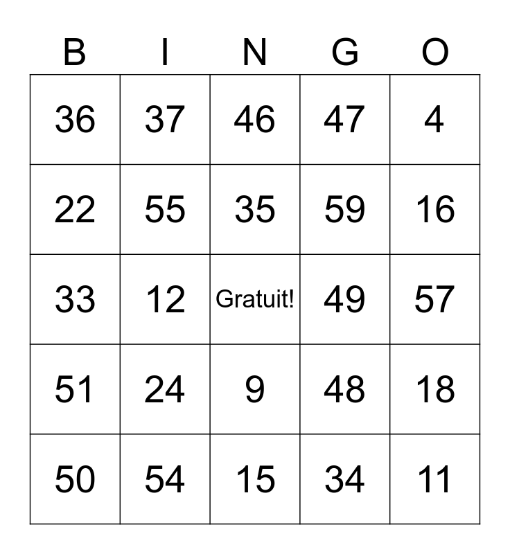 This bingo card has a free space and 24 words: 24, 54, 35, 50, 4, 36, 22, 37, 49, 9, 59, 33, 48, 18, 55, 34, 57, 46, 16, 12, 11, 51, 47 and 15.