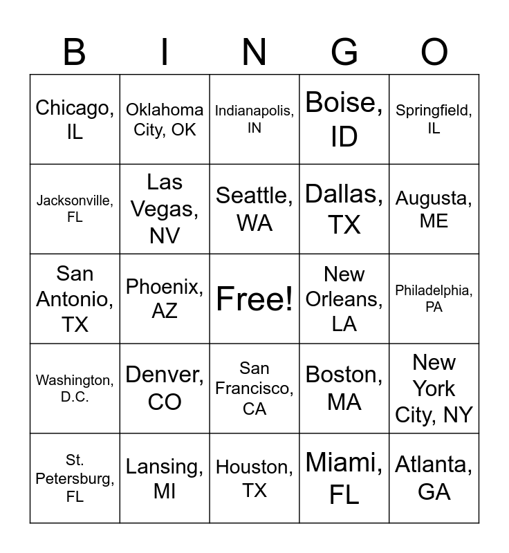 This bingo card has a free space and 28 words: New York City, NY, Pasadena, CA, Dallas, TX, Miami, FL, Jacksonville, FL, Indianapolis, IN, Oklahoma City, OK, Washington, D.C., New Orleans, LA, St. Petersburg, FL, San Antonio, TX, Boise, ID, Lansing, MI, Houston, TX, Augusta, ME, San Diego, CA, Denver, CO, Las Vegas, NV, Seattle, WA, San Francisco, CA, Chicago, IL, Memphis, TN, Atlanta, GA, Phoenix, AZ, Philadelphia, PA, Boston, MA, Springfield, IL and Detroit, MI.