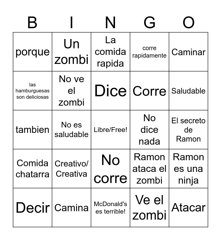 This bingo card has a free space and 24 words: Creativo/ Creativa, Camina, Dice, Decir, Caminar, porque, las hamburguesas son deliciosas, Un zombi, No dice nada, No corre, Corre, tambien, Ramon ataca el zombi, Ramon es una ninja, No ve el zombi, Ve el zombi, El secreto de Ramon, La comida rapida, Saludable, No es saludable, Atacar, Comida chatarra, corre rapidamente and McDonald's es terrible!.