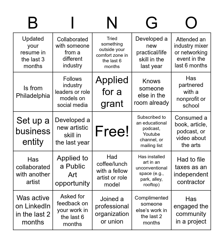 This bingo card has a free space and 39 words: Has a personal or business website, Has artist business cards, Has an artist Facebook and/or Instagram, Follows industry leaders or role models on social media, Was active on LinkedIn in the last 2 months, Had coffee/lunch with a fellow artist or role model, Applied for a grant, Attended a professional development workshop or seminar in the last 3 months, Attended an industry mixer or networking event in the last 6 months, Has collaborated with another artist, Developed a new artistic skill in the last year, Developed a new practical/life skill in the last year, Has engaged the community in a project, Consumed a book, article, podcast, or video about the arts, Subscribed to an educational podcast, Youtube channel, or mailing list, Applied to a Public Art opportunity, Turned down a project, Updated your resume in the last 3 months, Led or project managed a team, Has installed art in an unconventional space (e.g., park, alley, rooftop), Is from Philadelphia, Joined a professional organization or union, Knows someone else in the room already, Has partnered with a nonprofit or school, Purchased or used industry standard software, Presented at a conference, Researched EDI (equity, diversity & inclusion) practices for your art or business, Made and used a budget, Got a new job or gig in the last year, Collaborated with someone from a different industry, Sent follow-up email/note after an interview, Sent a follow up email after meeting a new networking contact in the last year, Tried something outside your comfort zone in the last 6 months, Asked for feedback on your work in the last 6 months, Complimented someone else’s work in the last 2 months, Had to review a contract for a project, Had to file taxes as an independent contractor, Set up a business entity and Helped someone else find a job in the last year.