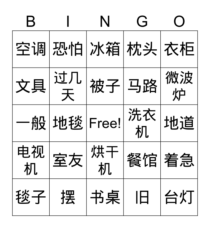 This bingo card has a free space and 24 words: 室友, 摆, 被子, 毯子, 衣柜, 空调, 文具, 恐怕, 洗衣机, 烘干机, 马路, 一般, 餐馆, 着急, 过几天, 旧, 地道, 冰箱, 微波炉, 地毯, 台灯, 电视机, 枕头 and 书桌.