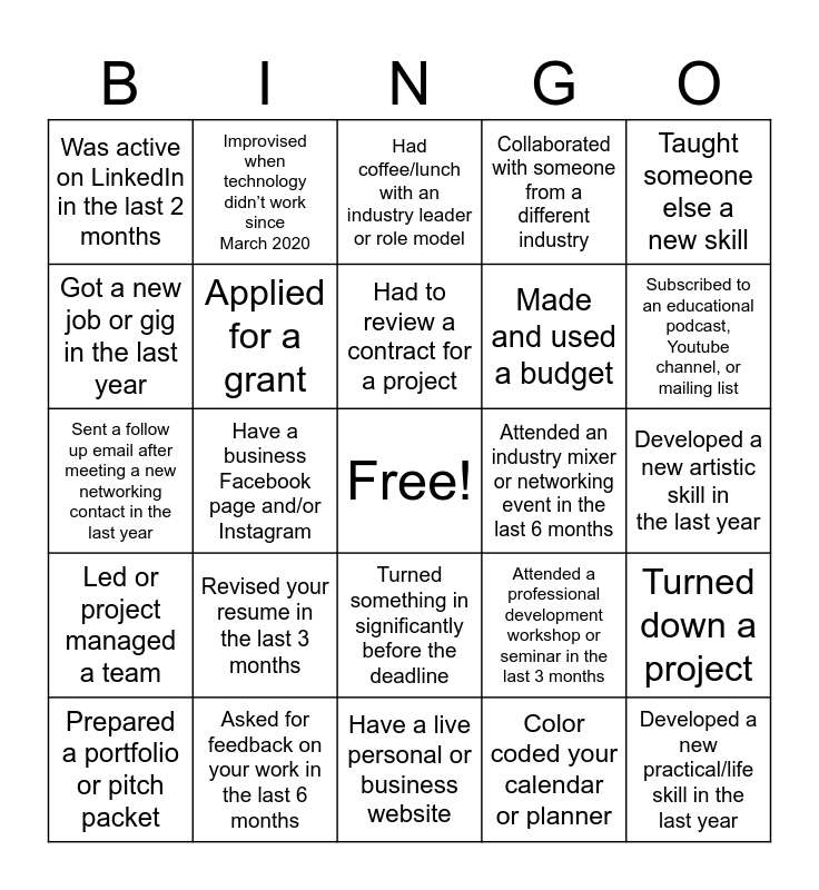 This bingo card has a free space and 31 words: Have a live personal or business website, Have business cards, Have a business Facebook page and/or Instagram, Followed industry leaders or role models on social media, Was active on LinkedIn in the last 2 months, Had coffee/lunch with an industry leader or role model, Applied for a grant, Attended a professional development workshop or seminar in the last 3 months, Attended an industry mixer or networking event in the last 6 months, Color coded your calendar or planner, Developed a new artistic skill in the last year, Developed a new practical/life skill in the last year, Developed a new healthy habit in the last year, Consumed a book, article, podcast, or video about your industry, Subscribed to an educational podcast, Youtube channel, or mailing list, Took a vacation/time off to reset, Turned down a project, Revised your resume in the last 3 months, Led or project managed a team, Turned something in significantly before the deadline, Taught someone else a new skill, Joined a professional organization or union, Prepared a portfolio or pitch packet, Improvised when technology didn’t work since March 2020, Made and used a budget, Got a new job or gig in the last year, Collaborated with someone from a different industry, Sent a follow up email after meeting a new networking contact in the last year, Asked for feedback on your work in the last 6 months, Had to review a contract for a project and Had to file taxes as an independent contractor.