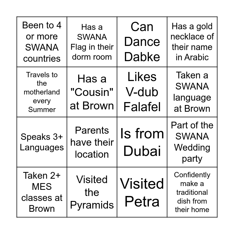 This bingo card has 16 words: Visited the Pyramids, Part of the SWANA Wedding party, Can Dance Dabke, Been to 4 or more SWANA countries, Speaks 3+ Languages, Has a SWANA Flag in their dorm room, Is from Dubai, Visited Petra, Travels to the motherland every Summer, Has a "Cousin" at Brown, Taken 2+ MES classes at Brown, Has a gold necklace of their name in Arabic, Parents have their location, Taken a SWANA language at Brown, Likes V-dub Falafel and Confidently make a traditional dish from their home.