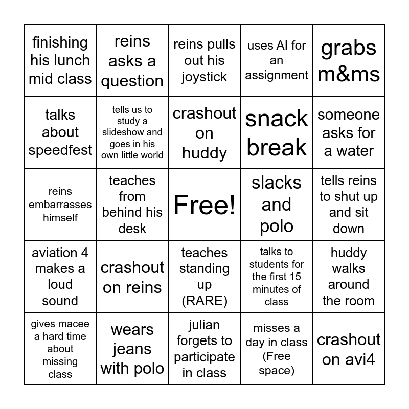 This bingo card has a free space and 24 words: crashout on reins, wears jeans with polo, crashout on huddy, gives macee a hard time about missing class, grabs m&ms, finishing his lunch mid class, talks about speedfest, reins asks a question, slacks and polo, teaches standing up (RARE), snack break, reins embarrasses himself, talks to students for the first 15 minutes of class, huddy walks around the room, tells us to study a slideshow and goes in his own little world, misses a day in class (Free space), tells reins to shut up and sit down, reins pulls out his joystick, someone asks for a water, teaches from behind his desk, crashout on avi4, aviation 4 makes a loud sound, uses AI for an assignment and julian forgets to participate in class.