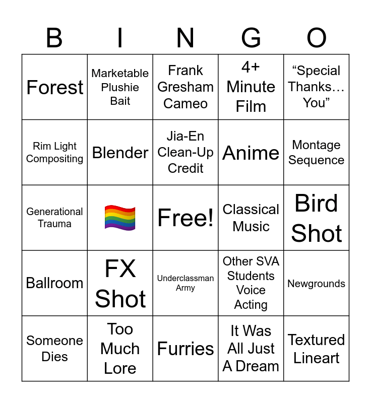 This bingo card has a free space and 33 words: Anxiety Manifestation, Robots, 🏳️🌈, Outer Space, Ballroom, Blender, “Special Thanks… You”, Someone Dies, Marketable Plushie Bait, Demo Reel Bait, Jia-En Clean-Up Credit, Frank Gresham Cameo, Crazy Camera Movement, 360/Rotating Shot, Classical Music, Montage Sequence, Too Much Lore, Generational Trauma, FX Shot, Other SVA Students Voice Acting, Underclassman Army, Crowd Shot, Forest, Bird Shot, Furries, Textured Lineart, 4+ Minute Film, Anime, Rim Light Compositing, Newgrounds, Fantasy, It Was All Just A Dream and No Dialogue.