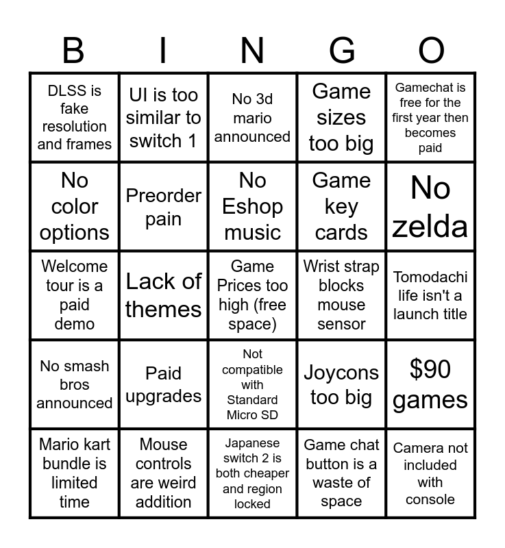 This bingo card has a free space and 24 words: Paid upgrades, Mouse controls are weird addition, No Eshop music, Mario kart bundle is limited time, Gamechat is free for the first year then becomes paid, DLSS is fake resolution and frames, No color options, UI is too similar to switch 1, Wrist strap blocks mouse sensor, Not compatible with Standard Micro SD, Game key cards, Welcome tour is a paid demo, Joycons too big, $90 games, Preorder pain, Game chat button is a waste of space, Tomodachi life isn't a launch title, No 3d mario announced, No zelda, Lack of themes, Camera not included with console, No smash bros announced, Game sizes too big and Japanese switch 2 is both cheaper and region locked.