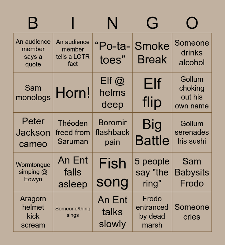 This bingo card has 28 words: Sam Babysits Frodo, Wall go boom, Elf flip, Frodo entranced by dead marsh, Sam monologs, “Po-ta-toes”, An audience member tells a LOTR fact, Wormtongue simping @ Eowyn, Big Battle, Aragorn helmet kick scream, Peter Jackson cameo, Smoke Break, Someone/thing sings, An Ent talks slowly, Gollum choking out his own name, Toss me!, An Ent falls asleep, Horn!, Elf @ helms deep, Fish song, An audience member says a quote, Someone cries, Boromir flashback pain, Théoden freed from Saruman, Gollum serenades his sushi, 5 people say "the ring", Someone drinks alcohol and Orc takes an arrow.
