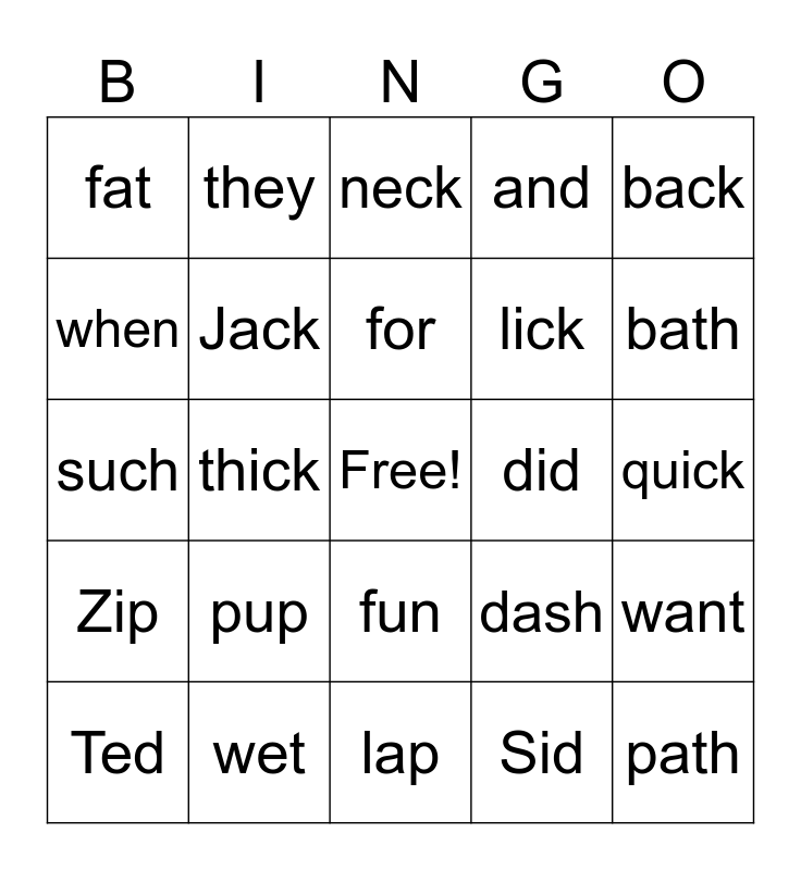 This bingo card has a free space and 29 words: Ted, wish, thick, pet, fat, neck, Jack, pup, did, wet, quick, path, lap, Sid, bath, chin, fun, Zip, back, such, dash, dug, lick, when, and, they, want, for and would.