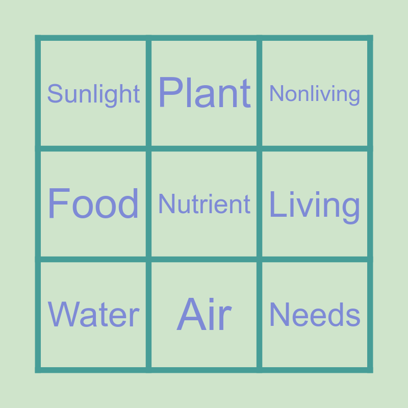 This bingo card has 10 words: Air, Nonliving, Sunlight, Nutrient, Food, Water, Plant, Animal, Living and Needs.