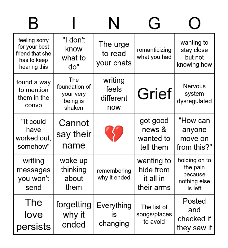 This bingo card has a free space and 24 words: woke up thinking about them, forgetting why it ended, writing feels different now, The love persists, wanting to stay close but not knowing how, feeling sorry for your best friend that she has to keep hearing this, found a way to mention them in the convo, "I don't know what to do", got good news & wanted to tell them, remembering why it ended, Grief, "It could have worked out, somehow", wanting to hide from it all in their arms, holding on to the pain because nothing else is left, The foundation of your very being is shaken, The list of songs/places to avoid, "How can anyone move on from this?", The urge to read your chats, Nervous system dysregulated, Cannot say their name, Posted and checked if they saw it, writing messages you won't send, romanticizing what you had and Everything is changing.
