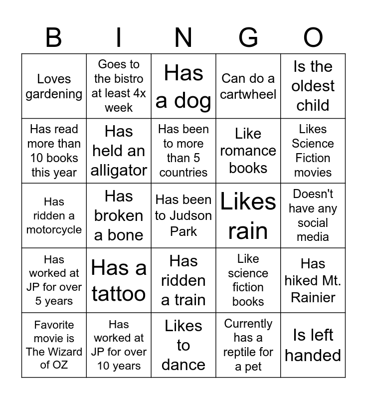 This bingo card has a free space and 77 words: Likes scary movies, Has a cat, Has a dog, Born in July, Is an only child, Plays an instrument, Likes to cook, Travels 3x a year, Travels out of the country at least once a year, Can juggle, Has met a celebrity, Is a birdwatcher or wildlife enthusiast, Has been to more than 5 countries, Has read more than 10 books this year, Has been skydiving, Has broken a bone, Born in the same month as you, Is left handed, Is the youngest child, Is the oldest child, Goes to the gym, Has ridden a motorcycle, Has held an alligator, Goes to the bistro at least 4x week, Can do a cartwheel, has been surfing, Speaks 2 languages, Traveled out of the country, Been at JP HC for over a year, Traveled to Europe, Has danced the Chicken Dance, Has eaten escargot, Can rub their head and pat their tummy, Like science fiction books, Likes Science Fiction movies, Like romance books, Likes romance movies, Been on an overnight cruise, Doesn't have any social media, Currently has a reptile for a pet, Is a reality tv junky, Been to more than 5 countries, Drives an electric car, Likes cats better than dogs, Was born in spring, Favorite food is Mexican, Favorite movie is The Wizard of OZ, Loves gardening, Favorite vacation spot is the beach, SUBA Dived to the depth of 95 feet, Has had stitches, Has ridden a train, Loves chocolate, Plays videogames, Likes superheroes, Prefers sweet snacks, Prefers salty snacks, Prefers coffee, Prefers tea, Likes karaoke, Has a tattoo, Enjoys camping, Enjoys hiking, Favorite holiday is Halloween, Favorite holiday is Christmas, Wears glasses, Likes snow, Likes rain, Likes sunshine, Has children, Has been to Mexico, Has hiked Mt. Rainier, Has worked at JP for over 5 years, Has worked at JP for over 10 years, Played sports as a child, Likes to dance and Likes to sing.