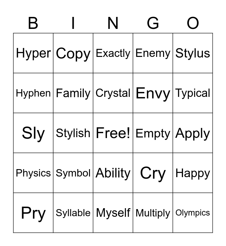 This bingo card has a free space and 24 words: Symbol, Syllable, Crystal, Pry, Stylus, Hyper, Hyphen, Copy, Empty, Ability, Envy, Sly, Cry, Happy, Family, Multiply, Apply, Exactly, Typical, Stylish, Olympics, Physics, Enemy and Myself.