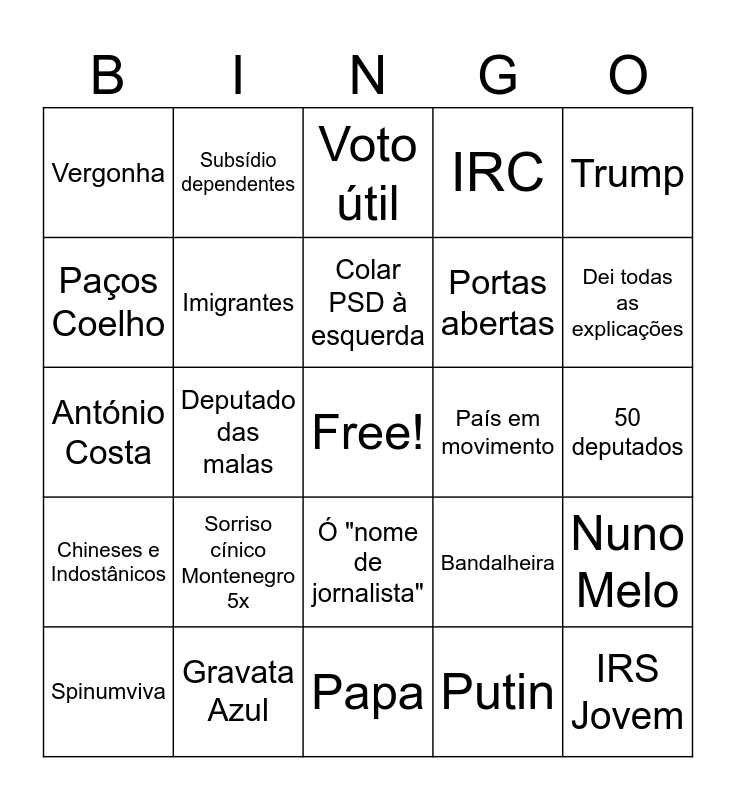 This bingo card has a free space and 36 words: Montenegrização, Deixar o Luís Trabalhar, 25 de Abril, Imigrantes, Bandalheira, Chineses e Indostânicos, Colar PSD à esquerda, Ventura mostra o papel 3x, Trump, Crimes do CHEGA, Deputado das malas, IRC, SNS, País em movimento, Dei todas as explicações, Vergonha, Corrupção, Sorriso cínico Montenegro 5x, IRS Jovem, Voto útil, 50 deputados, Nuno Melo, Gravata Azul, Spinumviva, Papa, Subsídio dependentes, António Costa, Ventura interrompe 5x, Portas abertas, Paços Coelho, Ucrânia, Preços das casas, Putin, Ó "nome de jornalista", Criminalidade and Manu.