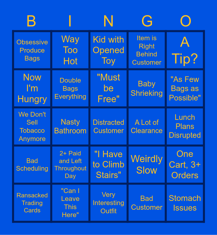 This bingo card has 60 words: Register Problems, "Can I Leave This Here", Bad Management, Bad Scheduling, Bad Customer, Terrible Customer, Double Bags Everything, Constant Crying, Baby Shrieking, Customers Keep Coming as You Try to Refill Bags, Item is Right Behind Customer, Customer Doesn't Understand Store Policy, Now I'm Hungry, Radio Disappears, Randomly Super Tired, Obsessive Produce Bags, Distracted Customer, A Tip?, "I Just Made It", "Must be Free", A Lot of Clearance, Kid with Opened Toy, Ransacked Trading Cards, One Cart, 3+ Orders, One Order, 3+ Carts, Very Patient Customer, Tax Exempt, Charity or School, "As Few Bags as Possible", Break At Least an Hour Late, Customers When Register Light is Off, Customer Reeks, Customer Bathed in Body Spray, Customer From Behind Register, Way Too Hot, Way Too Cold, Power Issues, Nasty Bathroom, Maintenance Comes to Vent to You, We Don't Sell Tobacco Anymore, Customer Claims Racism, 2+ Paid and Left Throughout Day, Lunch Plans Disrupted, Stupidly Busy, Weirdly Slow, Sure. Have a Free Space, Stubborn Security Measure, One Order, 4+ Warranty Questions, Tote Bags, "I Have to Climb Stairs", Very Interesting Outfit, Weird Customer Lore, Well Behaved Kids, Doesn't Understand Card Readers, Animal in the Cart, Police Presence, All Day Self Checkout, Random Headache, Stomach Issues and "Can I use cash".