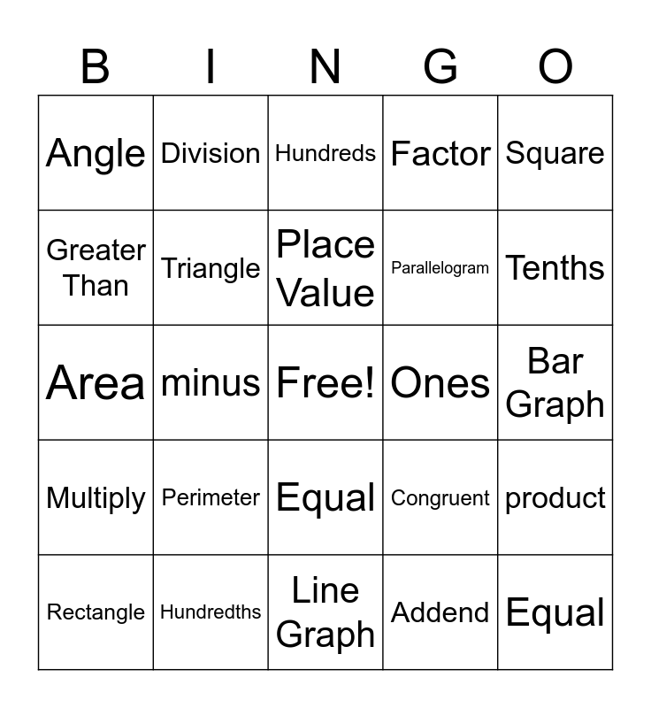 This bingo card has a free space and 34 words: Sum, Addend, Subtraction, Difference, Multiply, Triangle, Square, Rectangle, Division, Decimal, Place Value, Hundreds, Thousdandths, Tens, Ones, Tenths, Hundredths, Area, Perimeter, Congruent, Equal, Sides, Angle, Bar Graph, Line Graph, Equal, Factor, Multiple, Parallelogram, Greater Than, Less Than, minus, product and quotient.