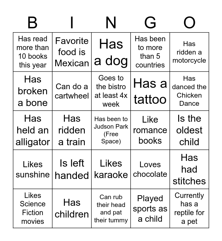 This bingo card has a free space and 78 words: Likes scary movies, Has a cat, Has a dog, Born in July, Is an only child, Plays an instrument, Likes to cook, Travels 3x a year, Travels out of the country at least once a year, Can juggle, Has met a celebrity, Is a birdwatcher or wildlife enthusiast, Has been to more than 5 countries, Has read more than 10 books this year, Has been skydiving, Has broken a bone, Born in the same month as you, Is left handed, Is the youngest child, Is the oldest child, Goes to the gym, Has ridden a motorcycle, Has held an alligator, Goes to the bistro at least 4x week, Can do a cartwheel, has been surfing, Speaks 2 languages, Traveled out of the country, Been at JP HC for over a year, Traveled to Europe, Has danced the Chicken Dance, Has eaten escargot, Can rub their head and pat their tummy, Like science fiction books, Likes Science Fiction movies, Like romance books, Likes romance movies, Been on an overnight cruise, Doesn't have any social media, Currently has a reptile for a pet, Is a reality tv junky, Been to more than 5 countries, Drives an electric car, Likes cats better than dogs, Was born in spring, Favorite food is Mexican, Favorite movie is The Wizard of OZ, Loves gardening, Favorite vacation spot is the beach, SUBA Dived to the depth of 95 feet, Has had stitches, Has ridden a train, Loves chocolate, Plays videogames, Likes superheroes, Prefers sweet snacks, Prefers salty snacks, Prefers coffee, Prefers tea, Likes karaoke, Has a tattoo, Enjoys camping, Enjoys hiking, Favorite holiday is Halloween, Favorite holiday is Christmas, Wears glasses, Likes snow, Likes rain, Likes sunshine, Has children, Has been to Mexico, Has hiked Mt. Rainier, Has worked at JP for over 5 years, Has worked at JP for over 10 years, Played sports as a child, Likes to sing, Prefers energy drinks and Has moved states/countries more than 5 times.