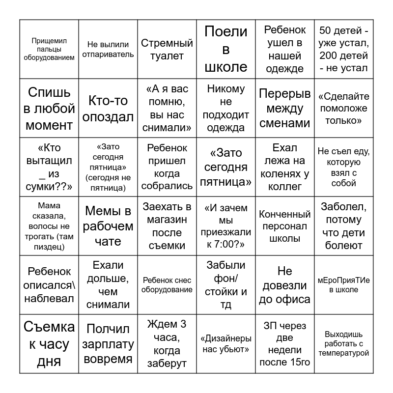 This bingo card has 36 words: Забыли фон/стойки и тд, Ребенок снес оборудование, «Дизайнеры нас убьют», Спишь в любой момент, Мама сказала, волосы не трогать (там пиздец), «Зато сегодня пятница», Кто-то опоздал, Ждем 3 часа, когда заберут, Ребенок ушел в нашей одежде, Не довезли до офиса, «Сделайте помоложе только», Поели в школе, мЕроПрияТИе в школе, «Зато сегодня пятница» (сегодня не пятница), Никому не подходит одежда, Прищемил пальцы оборудованием, Ребенок описался\ наблевал, Ехал лежа на коленях у коллег, «Кто вытащил _ из сумки??», Стремный туалет, Ребенок пришел когда собрались, Мемы в рабочем чате, «И зачем мы приезжали к 7:00?», Заехать в магазин после съемки, Конченный персонал школы, Не вылили отпариватель, Перерыв между сменами, Полчил зарплату вовремя, «А я вас помню, вы нас снимали», 50 детей - уже устал, 200 детей - не устал, Выходишь работать с температурой, Съемка к часу дня, Заболел, потому что дети болеют, Не съел еду, которую взял с собой, Ехали дольше, чем снимали and ЗП через две недели после 15го.