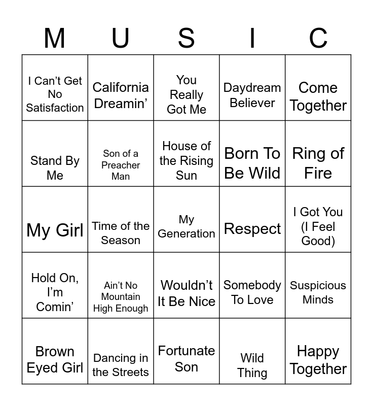 This bingo card has 25 words: Ain’t No Mountain High Enough, Fortunate Son, House of the Rising Sun, Brown Eyed Girl, Come Together, I Can’t Get No Satisfaction, Stand By Me, California Dreamin’, Respect, Wouldn’t It Be Nice, Born To Be Wild, My Girl, Somebody To Love, Suspicious Minds, Son of a Preacher Man, Happy Together, I Got You (I Feel Good), You Really Got Me, Ring of Fire, Time of the Season, My Generation, Dancing in the Streets, Hold On, I’m Comin’, Daydream Believer and Wild Thing.