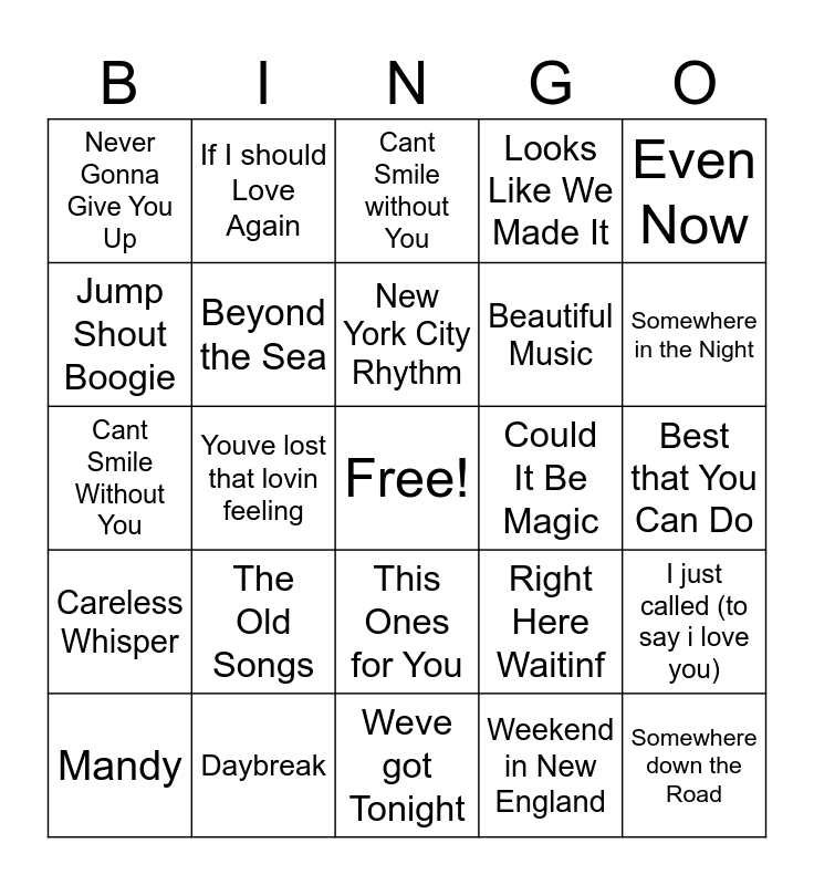 This bingo card has a free space and 44 words: Copacabanna, Somewhere down the Road, Trying to get that Feeling Again, Mandy, American Bandstand, Weekend in New England, Cant Smile without You, I Write the Songs, Even Now, Daybreak, Looks Like We Made It, Could It Be Magic, This Ones for You, The Old Songs, It's a Miracle, Weve got Tonight, Ships, Cant Smile Without You, Ready to take a Chance Again, Somewhere in the Night, If I should Love Again, Memory, Open Arms, Never Gonna Give You Up, Ive got the World on a String, Best that You Can Do, Time After Time, Ive had (time of my lfie), Right Here Waitinf, Careless Whisper, Against all Odds, I just called (to say i love you), Islands in the Stream, Whos been sleeping in my bed, Youve lost that lovin feeling, Some kind of Friend, I made it Through the Rain, One voice, New York City Rhythm, Jump Shout Boogie, Beautiful Music, Sailing, Beyond the Sea and Sweet Heaven (im in love again).