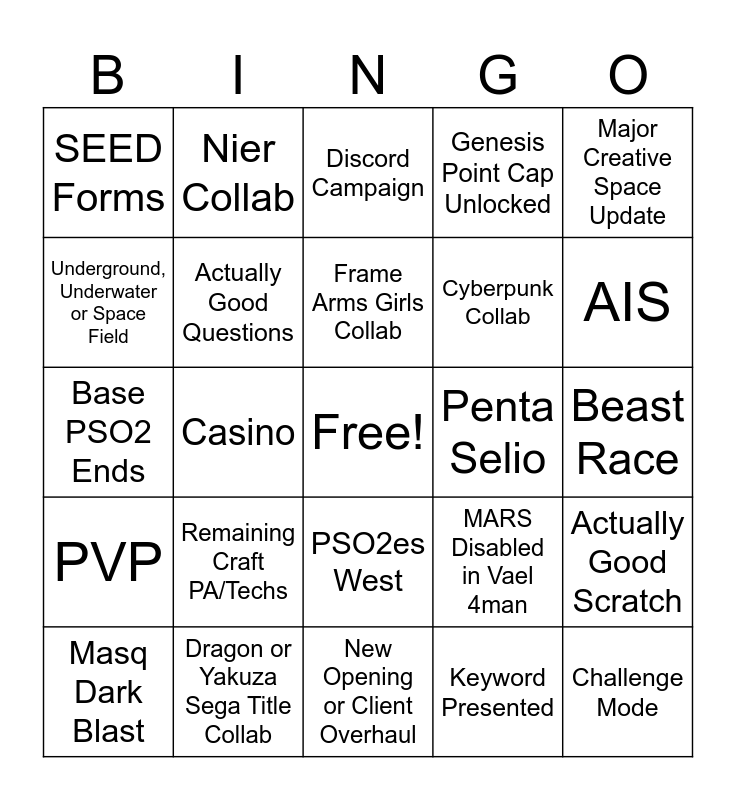 This bingo card has a free space and 24 words: Remaining Craft PA/Techs, Dragon or Yakuza Sega Title Collab, Frame Arms Girls Collab, Masq Dark Blast, Major Creative Space Update, SEED Forms, Underground, Underwater or Space Field, Nier Collab, Penta Selio, PSO2es West, Cyberpunk Collab, Base PSO2 Ends, MARS Disabled in Vael 4man, Actually Good Scratch, Actually Good Questions, Keyword Presented, Beast Race, Discord Campaign, AIS, Casino, Challenge Mode, PVP, Genesis Point Cap Unlocked and New Opening or Client Overhaul.