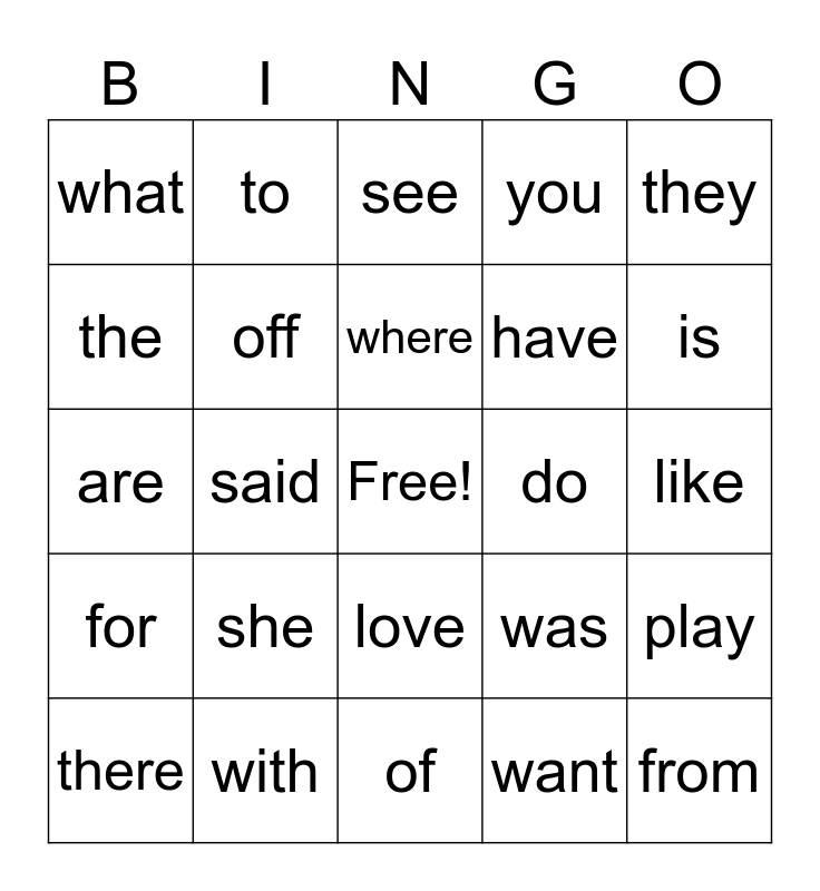 This bingo card has a free space and 24 words: she, with, where, there, they, what, the, to, do, love, have, are, was, play, off, want, like, see, is, said, from, for, you and of.