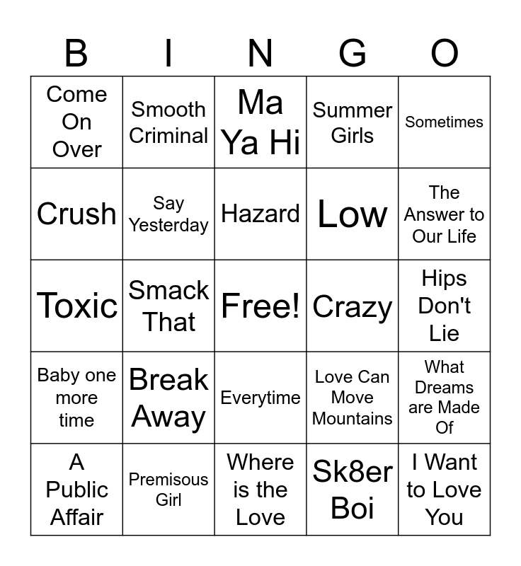 This bingo card has a free space and 29 words: A Public Affair, Fergalicious, Smack That, Everytime we Touch, Come On Over, Ma Ya Hi, Say Yesterday, Break Away, Crazy, Premisous Girl, Hips Don't Lie, I Want to Love You, Where is the Love, Sk8er Boi, The Answer to Our Life, Shut Up, Everytime, Baby one more time, Sometimes, Toxic, Love Can Move Mountains, Bad Day, Low, Crush, Summer Girls, Smooth Criminal, What Dreams are Made Of, Hazard and Atlanta.
