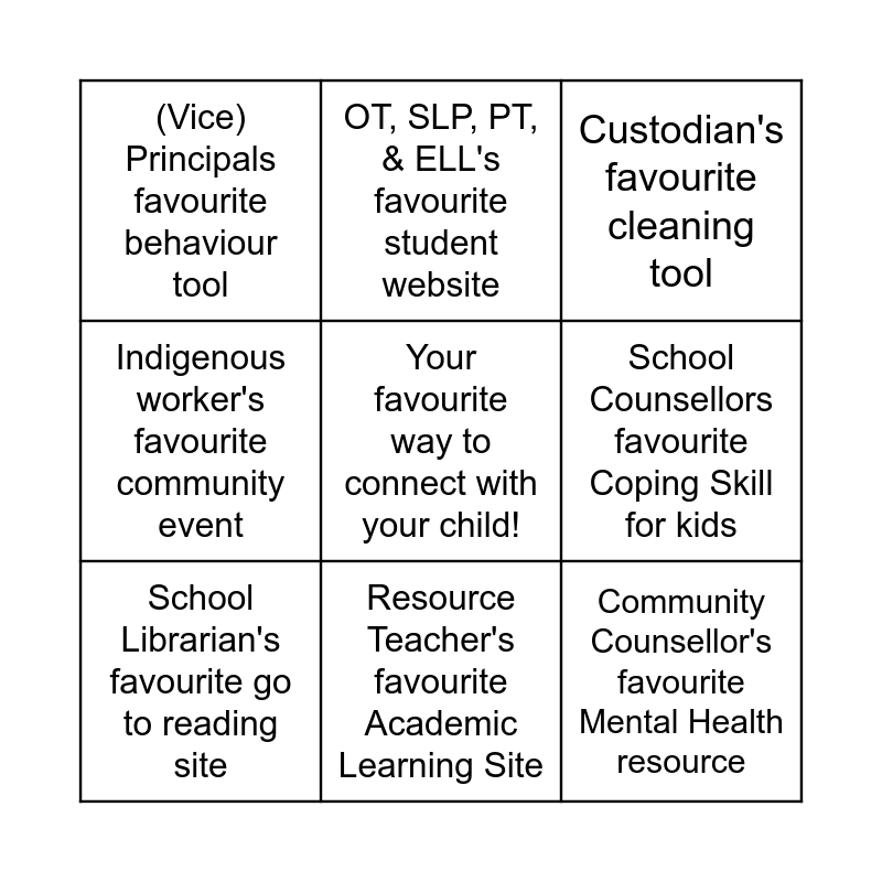 This bingo card has a free space and 8 words: School Counsellors favourite Coping Skill for kids, Custodian's favourite cleaning tool, OT, SLP, PT, & ELL's favourite student website, School Librarian's favourite go to reading site, (Vice) Principals favourite behaviour tool, Community Counsellor's favourite Mental Health resource, Indigenous worker's favourite community event and Resource Teacher's favourite Academic Learning Site.