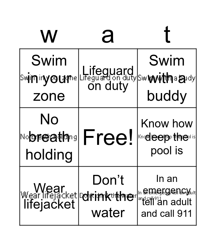 This bingo card has 19 images, a free space and 19 words: Walk dont run, No Diving in shallow water, Swim with a buddy, Make sure an adult is with you, No thunder or lightning, In an emergency tell an adult and call 911, Play with safety, Swim in your zone, Lifeguard on duty, Learn to swim, Stay away from drains, Know how deep the pool is, Wear lifejacket, Ask for permission, Stay hydrated, wear sunscreen, No breath holding, Don’t drink the water and Jump push turn grab.