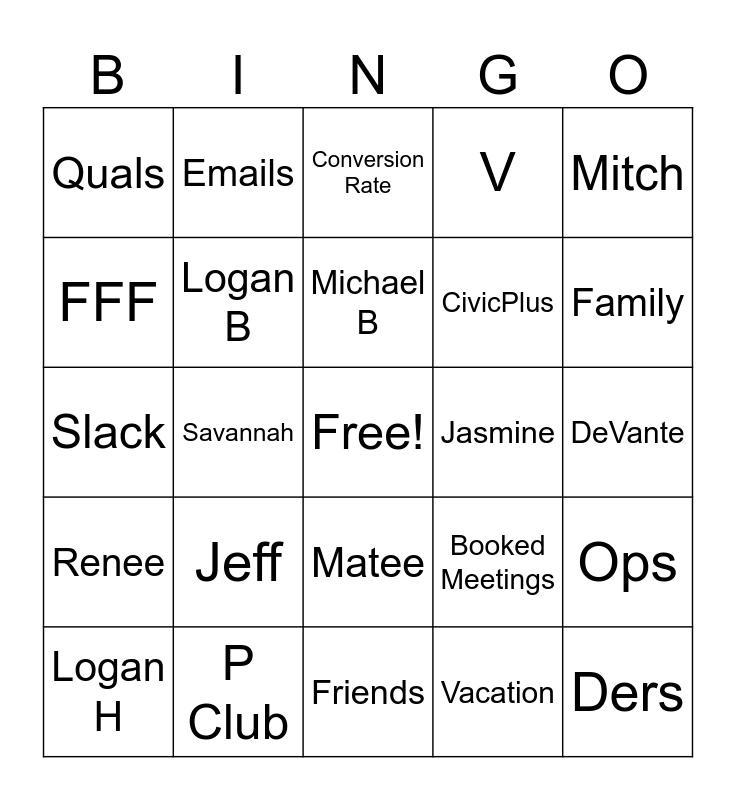 This bingo card has a free space and 39 words: Love, Fun, Pizza Parties, Logan B, Logan H, Matee, Michael B, Michael P, Mitch, Renee, Savannah, V, Ders, DeVante, Jasmine, Jeff, SQL, Quals, Calls, Booked Meetings, FFF, Friends, CivicPlus, Family, Friends, Morning Huddle, Music, Stretches, Games, Emails, Call Contacted, Motivation, Conversion Rate, P Club, Vacation, Accounts, Ops, Slack and Outreach.